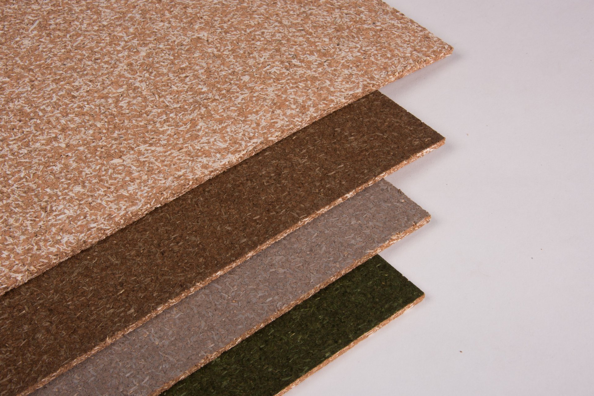 Massive cork and hemp fiber tiles, pigmented in color and finished with a natural water-repellent surface treatment.
